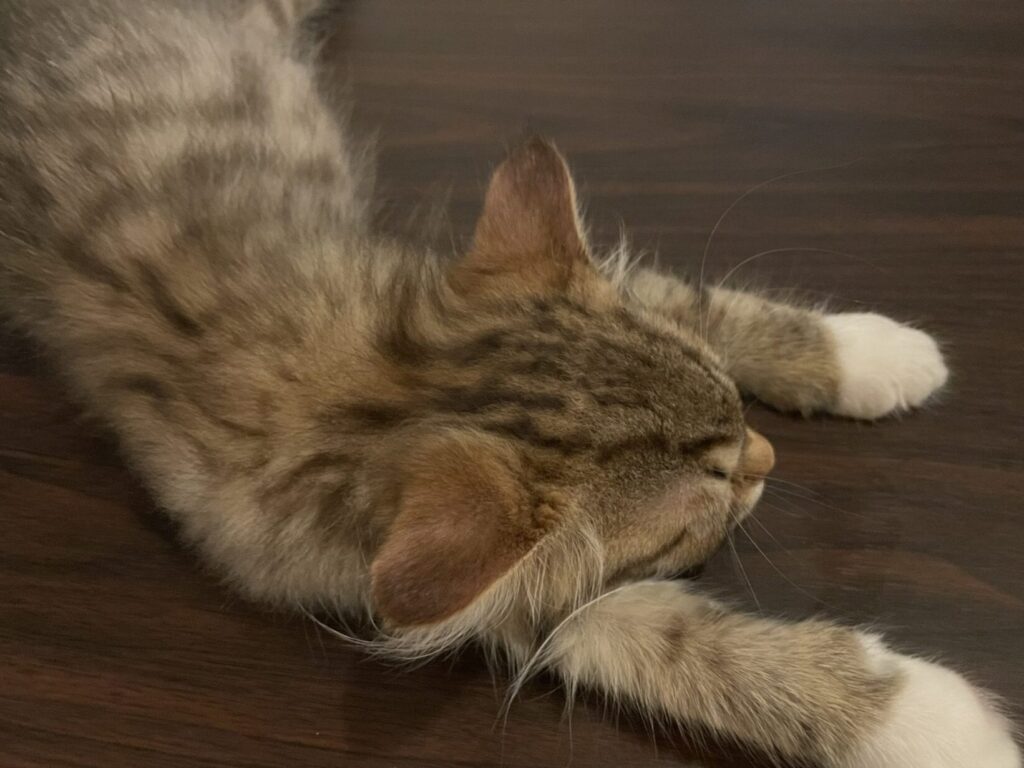 猫が前足を揃えて顔を床や毛布にうずめ、まるで土下座をして「ごめんなさい」をしているように見える寝姿のこと。