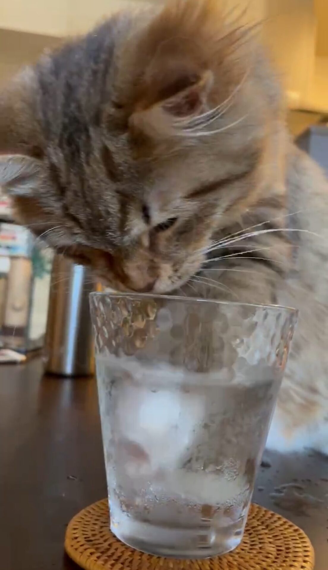 コップをみつけたらすかさず手を突っ込み水を飛ばして遊んで家中水浸しにしている(そのせいで我が家ではコップは全て蓋つきのタンブラーを使用)。水道の蛇口からお水を飲むのも大好き。顔が水浸しになっても特に気にならない。ベランダの水たまり、水びたしのお風呂場、濡れるのも気にせず駆け回っている。